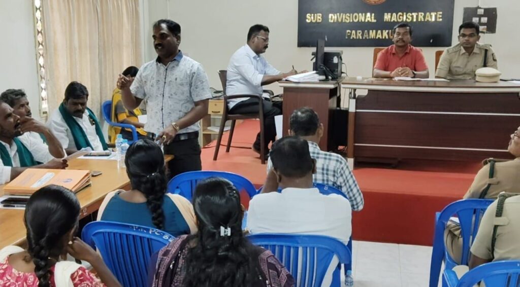 இதனையடுத்து பரமக்குடி வருவாய் கோட்டாட்சியர் அலுவலகத்தில் இன்று சமாதான கூட்டம் நடைபெற்றது. இதில் வருவாய் கோட்டாட்சியர் சரவணபெருமாள், டிஎஸ்பி சபரிநாதன், வனத்துறை, வேளாண்மை அதிகாரிகள் உட்பட பலர் கலந்து கொண்டனர். முதல்வரை சந்தித்து தங்களது கோரிக்கைகளை தெரிவிக்க மாவட்ட நிர்வாகம் சார்பில் உரிய நடவடிக்கை எடுக்கப்படுவதாக அதிகாரிகள் கூறியதையடுத்து கவனயீர்ப்பு ஆர்ப்பாட்டம் ரத்து செய்யப்படுவதாக விவசாயிகள் சங்கம் சார்பில் தெரிவிக்கப்பட்டுள்ளது.