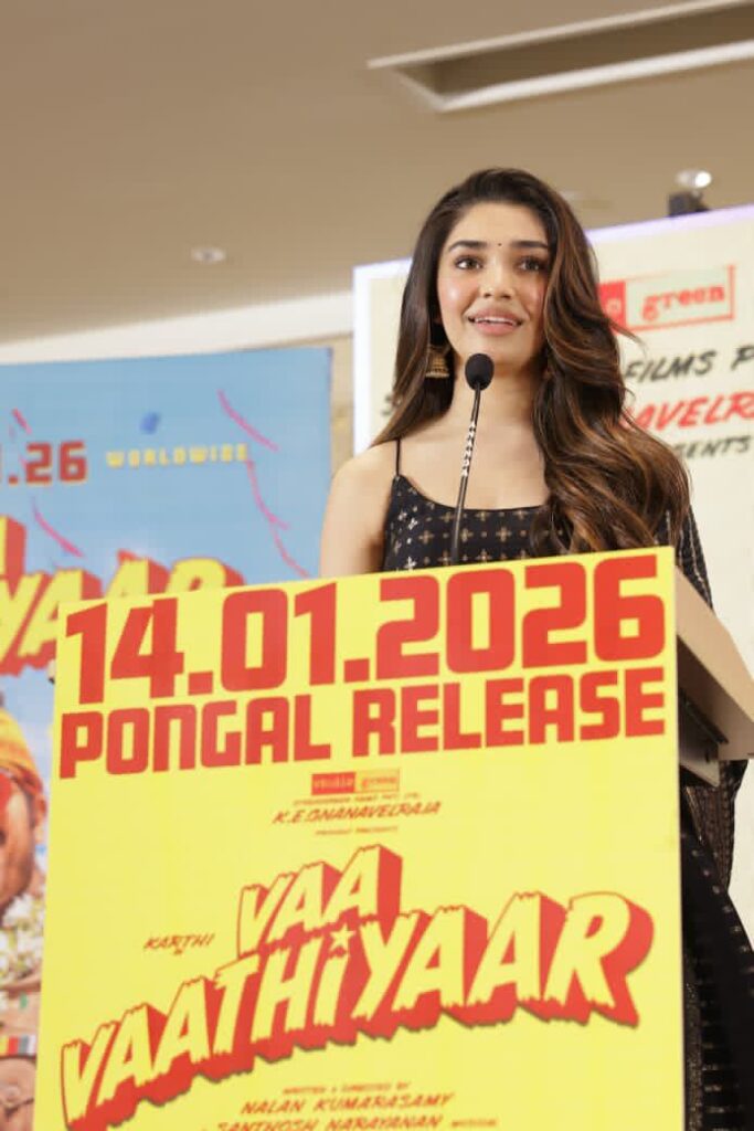 நடிகை கிருத்தி ஷெட்டி பேசியதாவது.., ஒரு பேட்டியில் நலன் ஒரே விஷயத்தை இது ஒரு பெஸ்டிவல் படம். பல குடும்பங்கள் ஒன்றாகச் சேர்ந்து வந்து பார்க்கிற படம் என்று சொன்னார். இப்போது அது அப்படியே நடந்துள்ளது. குடும்பமா, நண்பர்களோடு, எல்லாரும் சேர்ந்து படம் பார்க்கிற மாதிரி இந்த படம் மாறியிருக்கிறது. அதுக்கு நான் ரொம்ப ரொம்ப சந்தோஷப்படுறேன். இந்த படம் தாமதமானது பற்றி நிறைய பேர் என்கிட்ட கேட்டார்கள். அந்த நேரத்தில் எனக்கும் கொஞ்சம் வருத்தமா தான் இருந்தது. ஆனால் நான் ஒன்று நம்புகிறேன், நல்ல விஷயம் நடக்கவேண்டுமானால், அதுக்கு ஒரு சரியான நேரம் இருக்கும். கடவுள் நம்மளை காத்திருக்க வைக்குறார்னா, அதுக்குப் பின்னால் ஒரு பெரிய திட்டம் இருக்கும்னு நம்புறேன். அதனால இப்போ எல்லாம் சரியா நடந்ததுக்கு நான் ரொம்ப மகிழ்ச்சியா இருக்கிறேன். இந்தப்படத்தில் என்னைச் சேர்த்ததுக்காக நலன், மற்றும் ஞானவேல் இருவருக்கும் என் மனமார்ந்த நன்றி. நலன் இந்த படத்திற்காக எவ்வளவு கடினமா உழைத்திருக்கார்னு நான் நேரில பார்த்திருக்கேன். அவர் வெற்றியைப் பார்க்க ஆவலாக இருக்கிறேன். கார்த்தி சாரின் தீவிர ரசிகை நான், ஆனால் அவரை நேரில சந்திச்ச பிறகு, நான் இன்னும் பெரிய ரசிகையா மாறிவிட்டேன். ‘வா வாத்தியார்’ கதாபாத்திரம் பெரியதாக இருந்தாலும், அதை அவரைவிட சிறப்பாக யாராலும் செய்ய முடியாது. கார்த்தி மனதளவில் மிகச்சிறந்த மனிதர். அது அவரது கதாப்பாத்திரங்களிலும் பிரதிபலிக்கிறது, வா வாத்தியார் ஒரு நல்ல மனசு கொண்ட கேரக்டர் அது அவருக்குள்ள இயல்பாகவே இருக்கிறது. நான் அவரிடமிருந்து நிறைய கற்றுக்கொண்டேன். சந்தோஷ் நாராயணன் இசை படத்திற்கு மிகப்பெரிய பலமாக அமைந்துள்ளது. இப்படத்தில் உழைத்த அத்தனை கலைஞர்களுக்கும் நன்றி என்றார்.