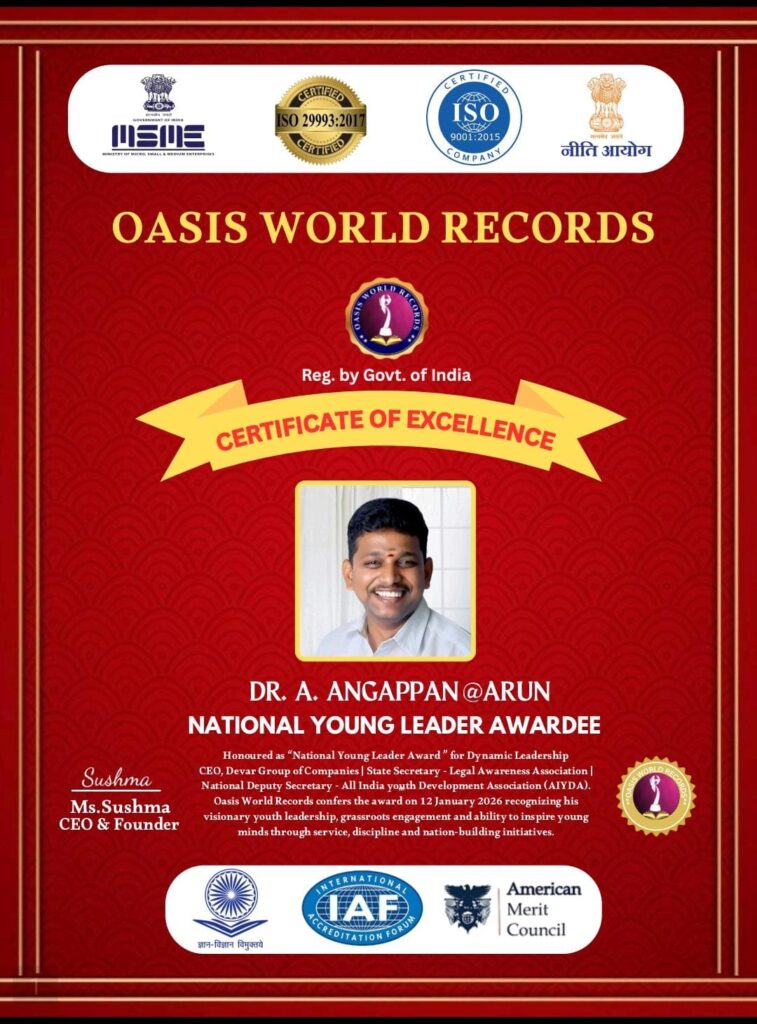தேசிய யுவா தினத்தில் சர்வதேச கௌரவம் தேசிய யுவா தினத்தின் சிறப்பான நாளில், டாக்டர் ஏ. அங்கப்பன் @ அருண் ஜி Oasis World Records மூலம் மிக முக்கியமான இளம் தலைவராக (Most Prominent Youth Leader) தேசிய இளம் இளைஞர் விருது (National Young Leader Award) பெற்றார். இந்த விருது, அவரது தொலைநோக்குப் பணிகள், நாட்டுப்பற்று, மற்றும் இளைஞர் வளர்ச்சிக்கான தொடர்ந்து செய்யும் முயற்சிகளுக்கு சர்வதேச அங்கீகாரம் அளிக்கிறது.